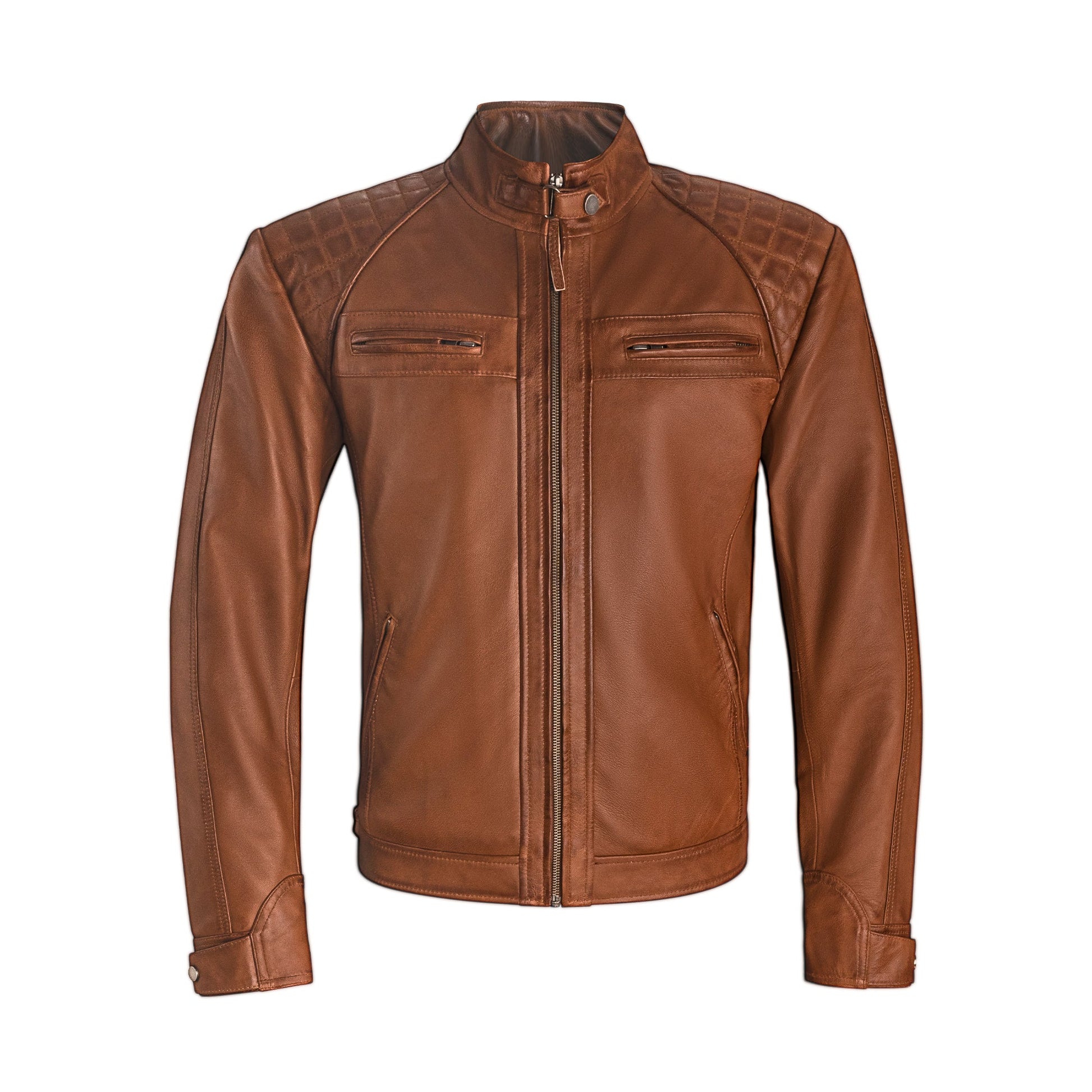 The Urban Rider Leather Jacket features a stand collar with snap button closure, and zippered chest and side pockets that not only add to the style but also provide practicality for storing your essentials. The full-length front zipper makes it easy to wear and remove, while the tailored fit enhances your silhouette, giving you the perfect balance of comfort and sophistication.